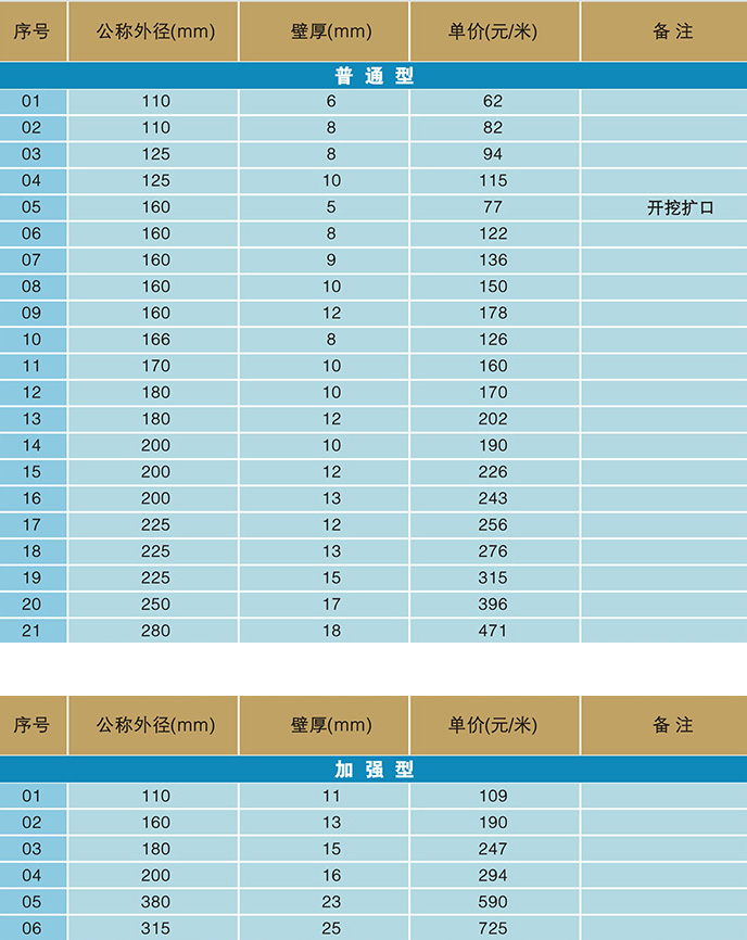 韌性好,具有優(yōu)良的抗地層沉降及抗震性能。常用管材分為普通型和加強型。普通型適用于開挖鋪設(shè)施工和非開挖穿越施工埋深小于4米的工程;加強型用于非開挖穿越施工埋深大于4米的工程。